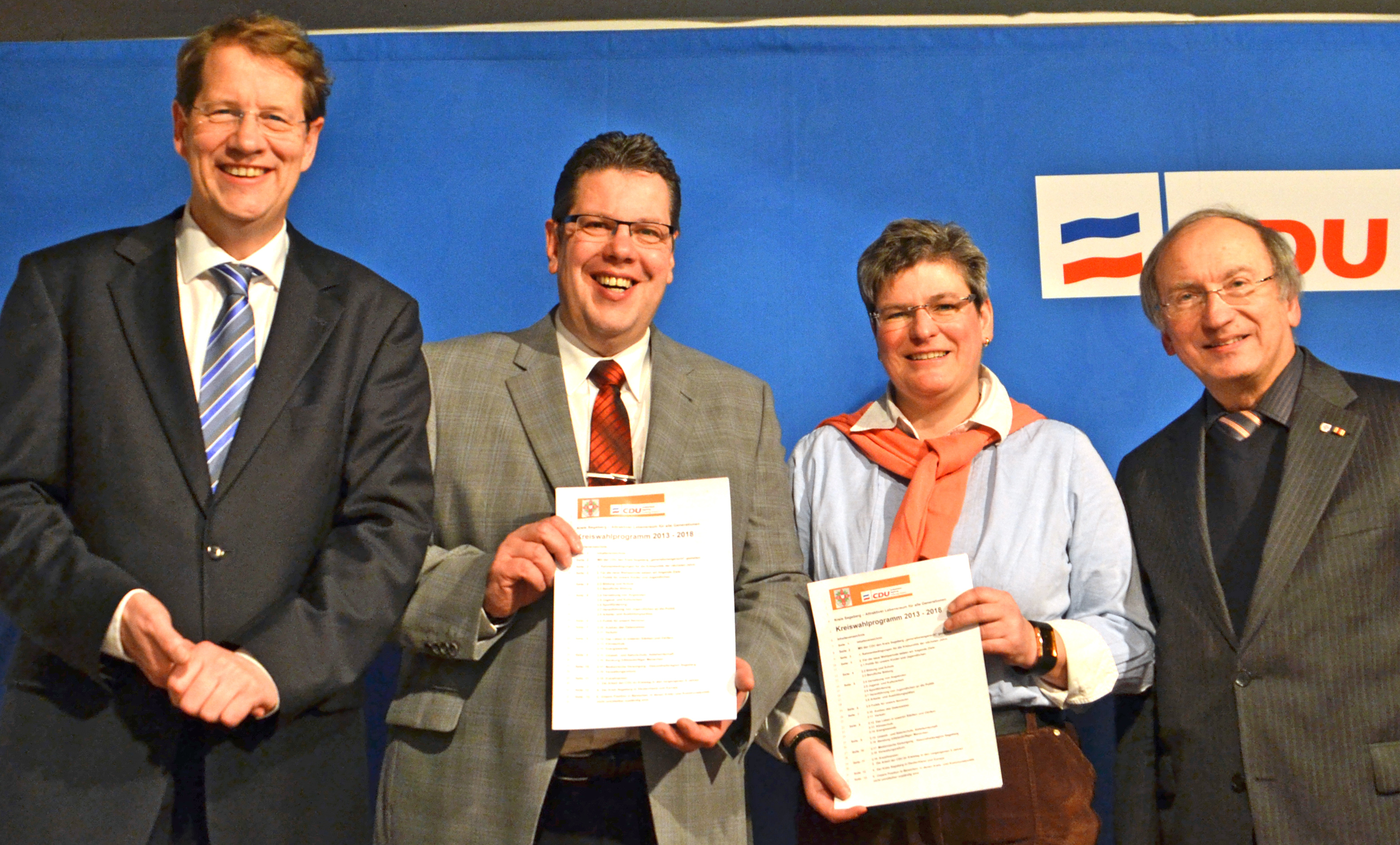 Zufriedene Mienen nach einem gelungenen Mitgliederparteitag: Der CDU-Kreisvorsitzende Gero Storjohann MdB, Spitzenkandidat Claus Peter Dieck, die Kreistagsabgeordnete Annette Glage aus Boostedt und Kreispräsident Winfried Zylka, der Vorsitzende der Programmkommission.